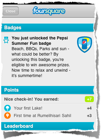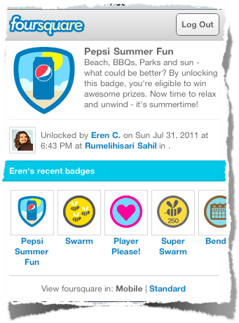 Ayrıca marka sayfalarınızın badge’lerini unlock edenlere özel fırsatlar verebiliyorsunuz. Aşağıda benim unlock ettiğim Pepsi Fun Badge’in ekran görüntülerini bulabilirsiniz.