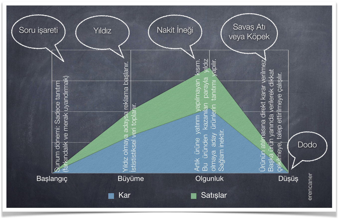 Nakit İneği: Ürüne yatırım yapmayı bıraktığınız çünkü kendi kendine pazarda tutunduğu dönemdir. Buradan kazanılan para soru işareti ürünlerin tanıtımı için harcanır. Bir çocuğun üniversiteyi bitirip iş hayatına girmesiyle küçük kardeşinin okul masraflarını karşılamaya başlaması gibi.