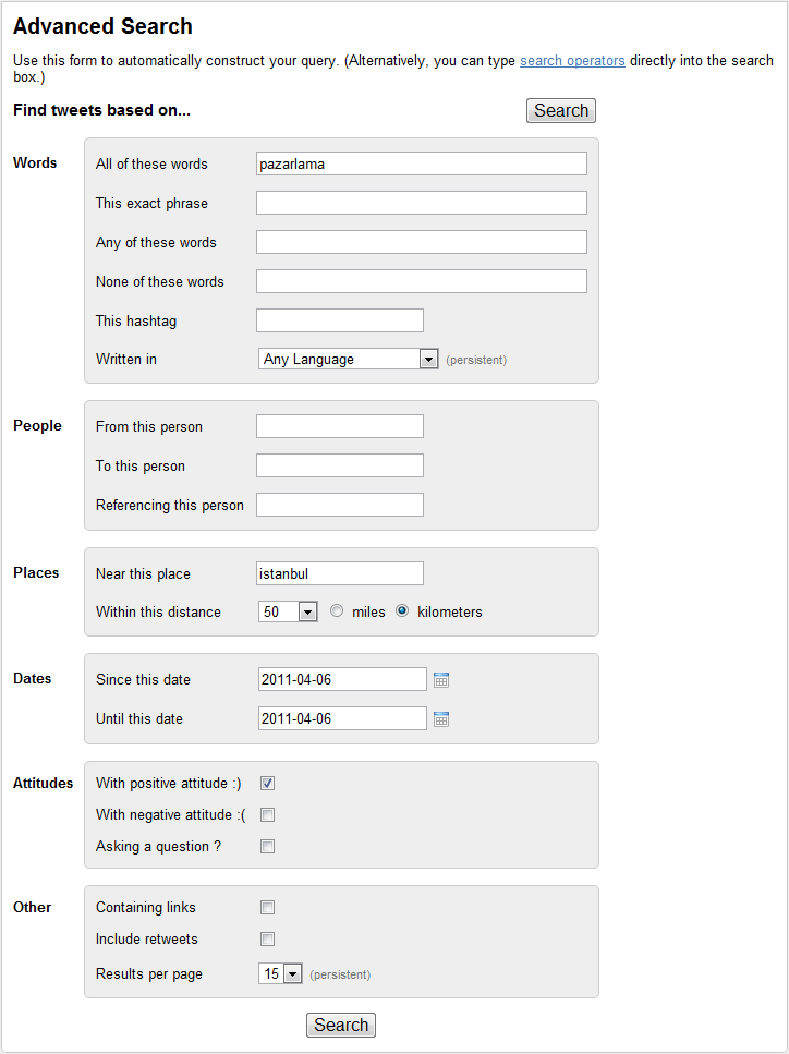Örneğin aşağıdaki gibi bir filtreleme kullanarak 06.04.2011 tarihinde “pazarlama” kelimesi hakkında İstanbul ve 50 km civarından neler konuşulmuş öğrenebilirsiniz..