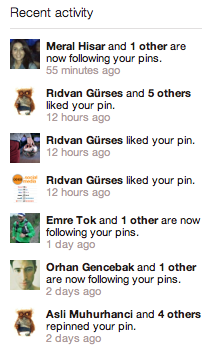 İkinci olarak, Pinterest yapısı itibariyle etkileşime çok daha açık bir mecra. Yani sizin Twitter’da kullanıcılar tweet’lerimi retweet etsin, favorilerine eklesin ya da mention atsın diye takipçi açısından bayağı bir kasmanız lazım çok ekstra eğlenceli şeyler yazmıyorsanız. Fakat Pinterest’te az takipçiniz de olsa, pin’lediğiniz görseller çok ulu orta olduğu için bir çok kişi tarafından görülebiliyor ve direkt repin’leniyor ya da like ediliyor. Twitter’da da fotoğraf paylaşmak etkileşim için güzel bir yoldur ama Twitter’da bir fotoğrafı kullanıcının görmesi için linke tıklaması gerekir. Pinterest’te direkt görünür.
