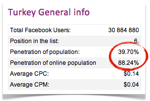 Facebook, Türkiye’de internet kullanan nüfusun %88’ine ulaşmış durumda. Yani kabaca her 10 internet kullanıcısının 9’unun Facebook hesabı var diyebiliriz. Fakat genel nüfus içerisinde Facebook kullanımı hala %39’larda seyrediyor. Bu da demek oluyor ki Türkiye’de internet kullanan kesim arasında Facebook doygunluğa ulaşmış, interneti olan hemen herkesin Facebook hesabı var. İşe sadece internet kullanıcıları açısından bakarsak Facebook kullanıcı sayısı artık çok fazla artmaz diyebiliriz. Fakat bir de interneti kullanmayan kitle var -ki bu da yukarıda bahsettiğim toplam nüfus içerisinde %39’luk kesimin dışında kalan %61’lik kesim oluyor.- bu kitle arasında ne internet ne Facebook kullanılmıyor.