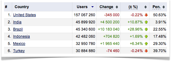 Facebook kullanım oranlarını SocialBakers’tan takip edenler bilirler. Türkiye Facebook kullanıcı sayısında 2011’de kısa bir süre tüm dünyada 3.’lüğe kadar yükselmişti ve biz de o zaman sevgili Hasan Başusta ile Promoqube’deyken konuyu çok incelemiş ve hakkında bir yazı yazmıştık. Şimdilerde ise Türkiye 6. sıralarda. Bu yazımdaysa konuyu biraz anlamlandırmaya çalışıp Türkiye nüfus yapısına bağlı olarak hangi durumlarda ve tahmini ne zaman kullanıcı sayısında artış yakalar konusunda akıl yürütmeye çalışacağım.